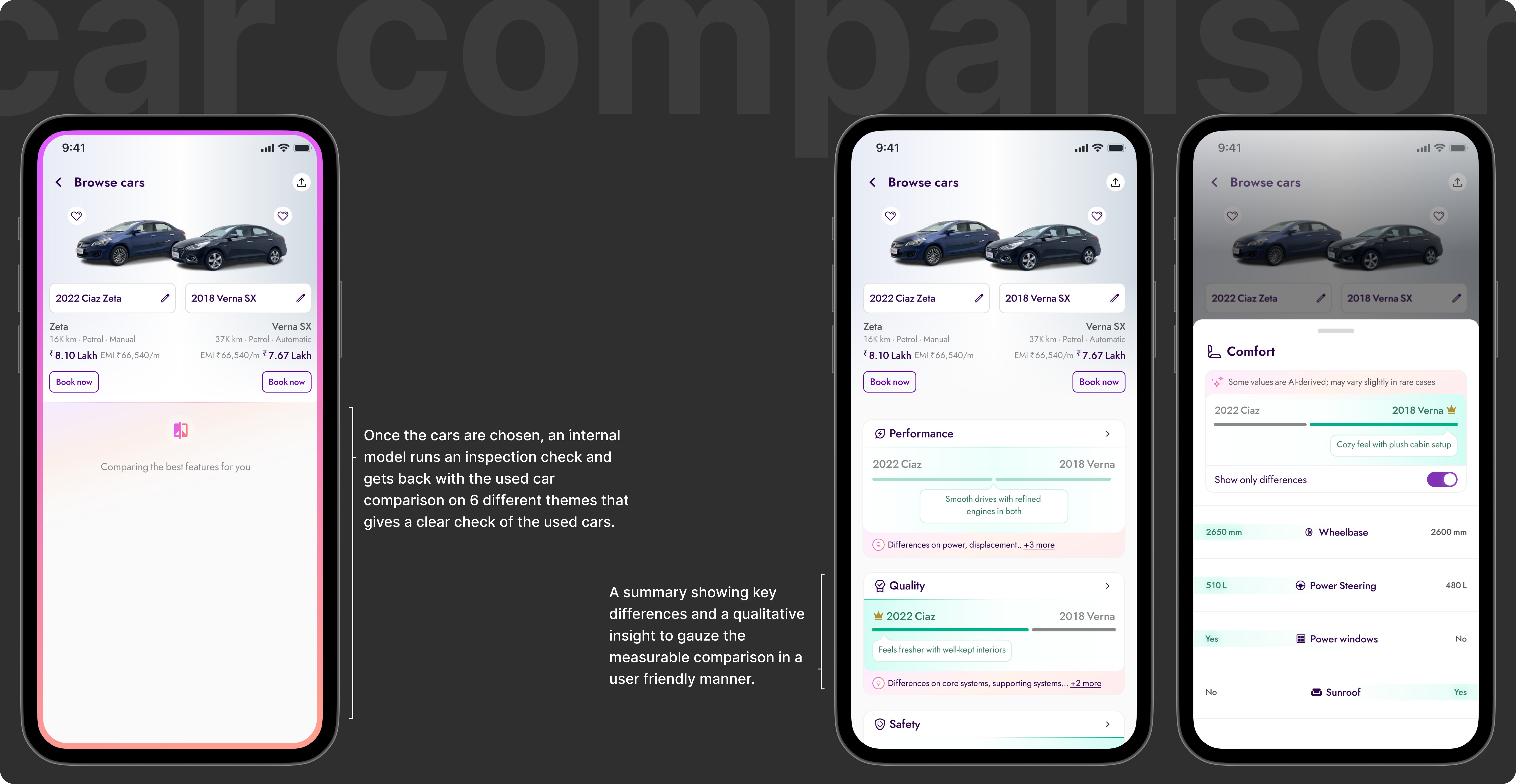 Three screens with a clear hierarchy of jobs: select, compare, decide. Notice that none of these screens introduce unfamiliar UI patterns — the card language is the same as listings, the navigation chrome doesn't change. The only new idea is the difference indicator. Familiar enough to trust, specific enough to act on.
