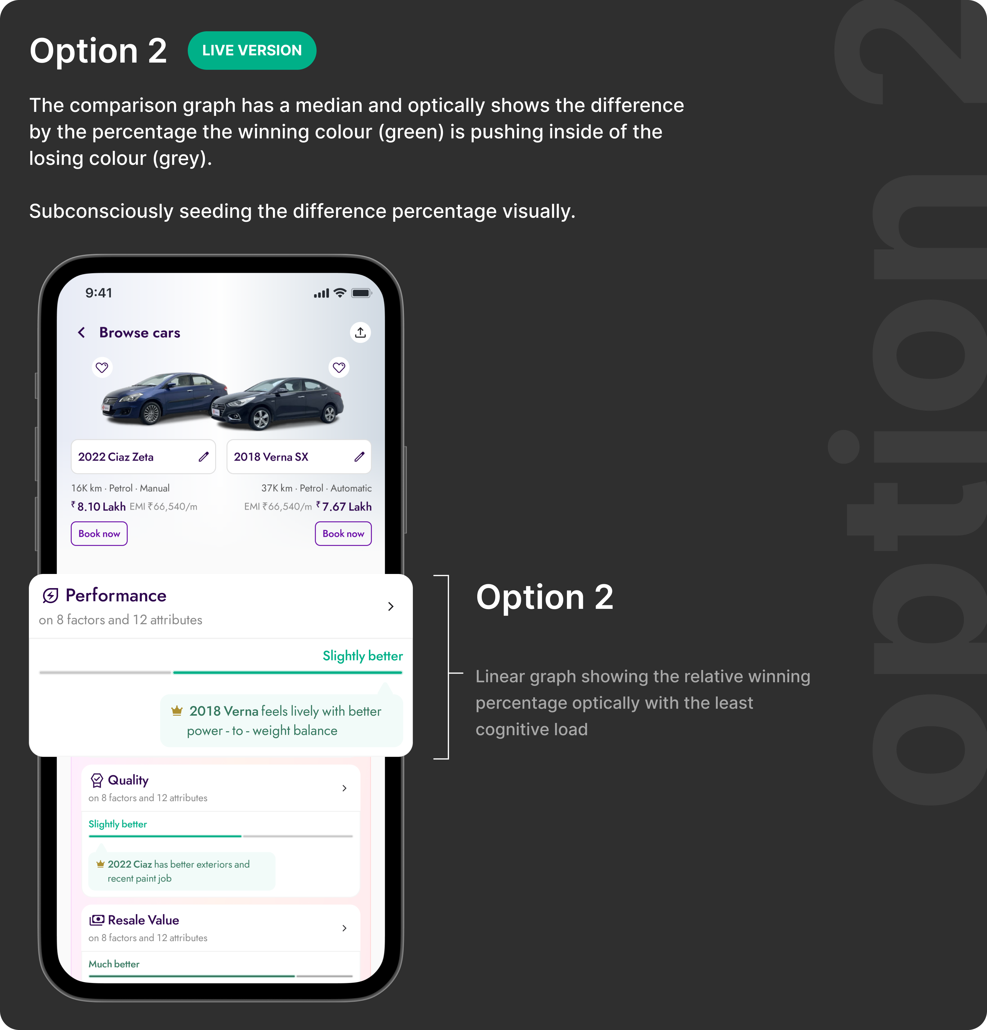Option 2 · shipped.A single axis makes one car the implicit reference point. The delta reads instantly — no arithmetic, no toggling, no memory. The user's job shifts from “calculate which is better” to “confirm what I already sense.” That shift is the design.