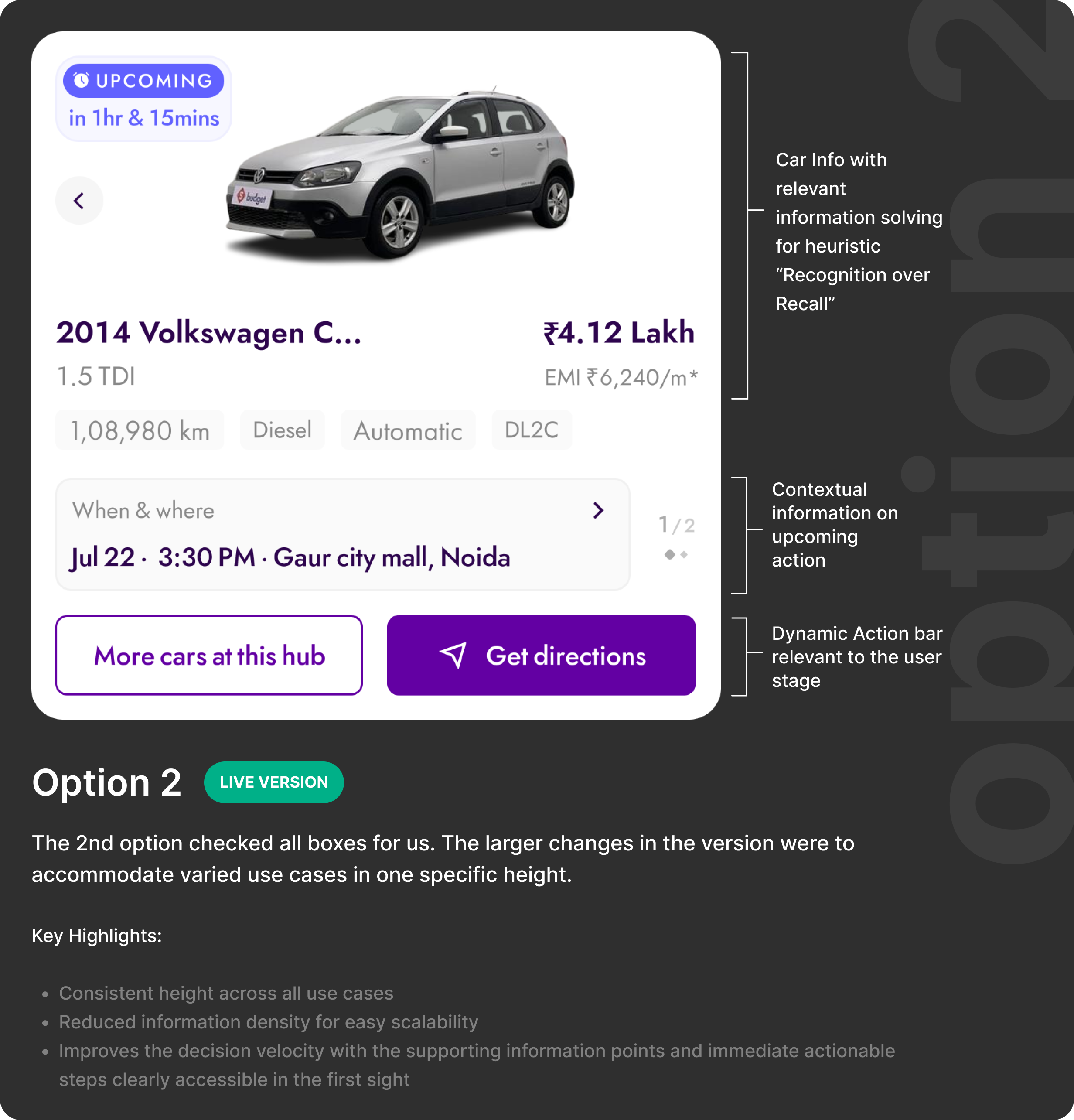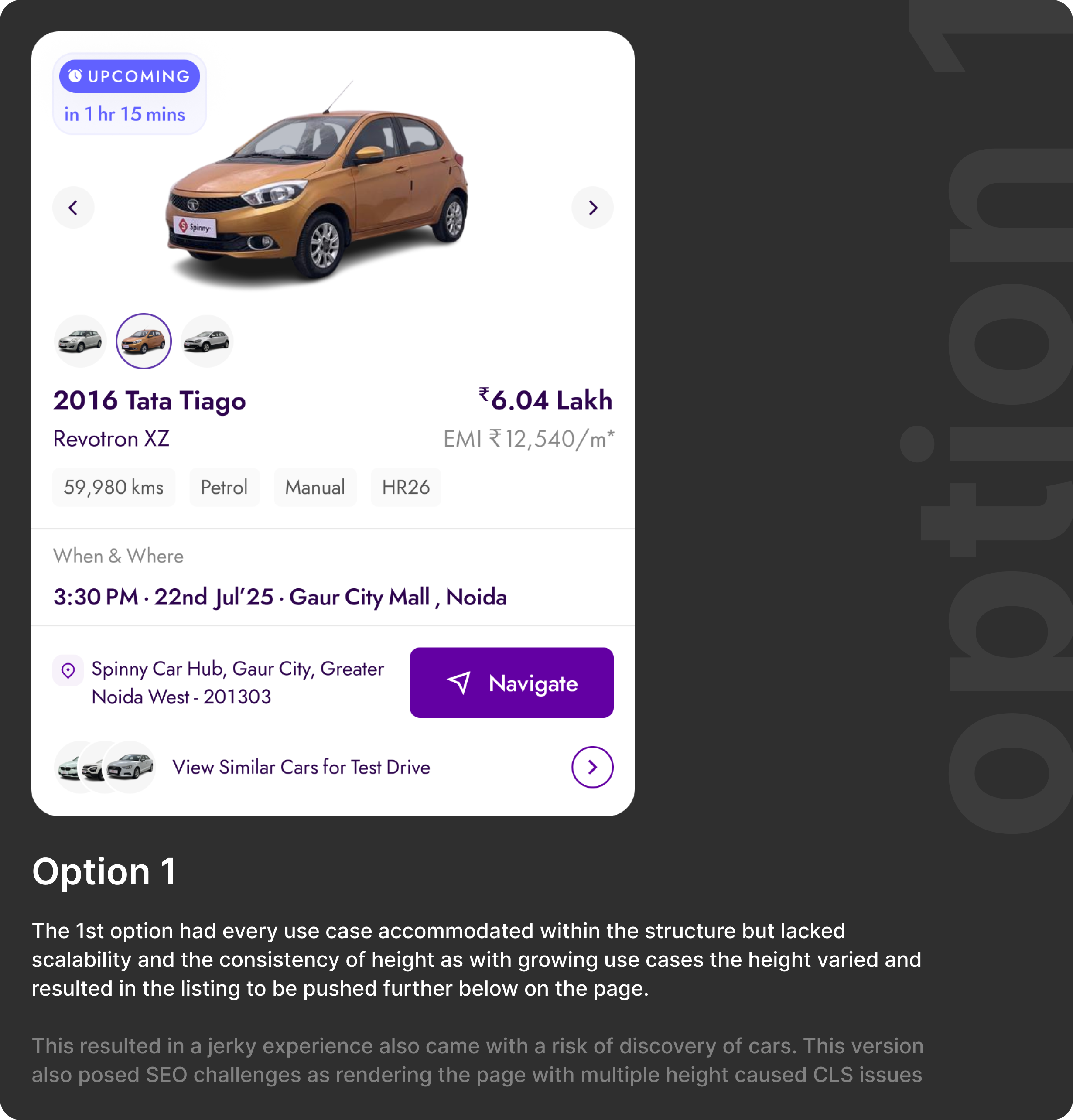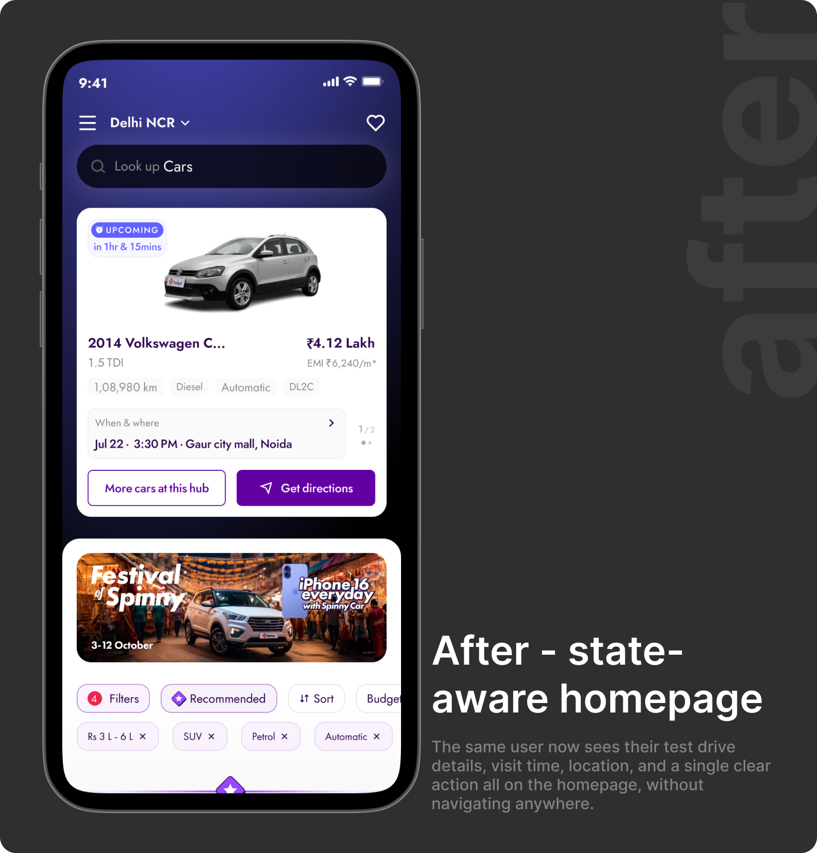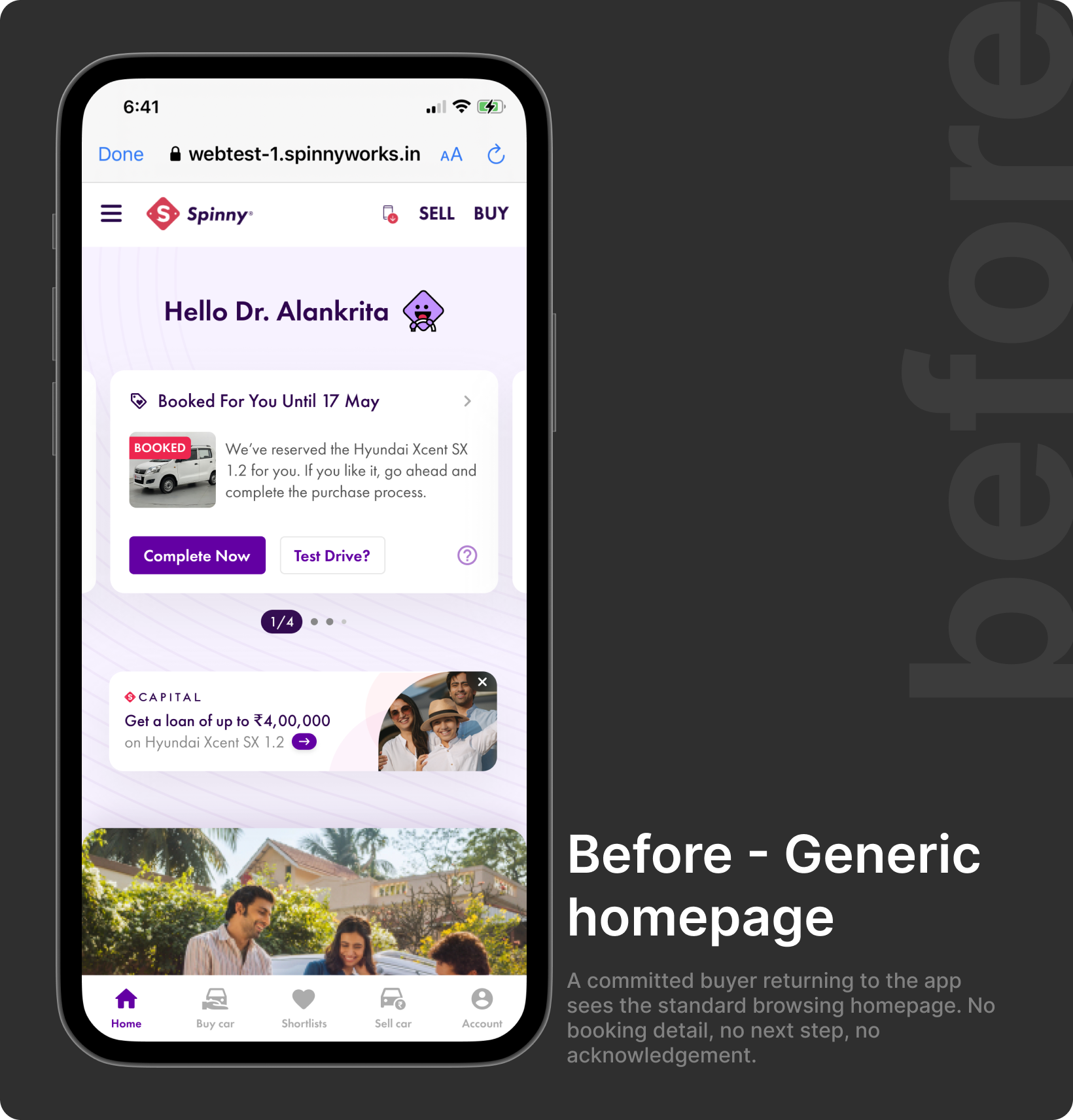 Spinny's homepage was designed for discovery, browsing, filtering, comparing. It served exploratory users well. But a large cohort of returning users had already committed. They'd scheduled a test drive, made a booking, or were waiting on delivery. For them, the homepage showed nothing relevant.